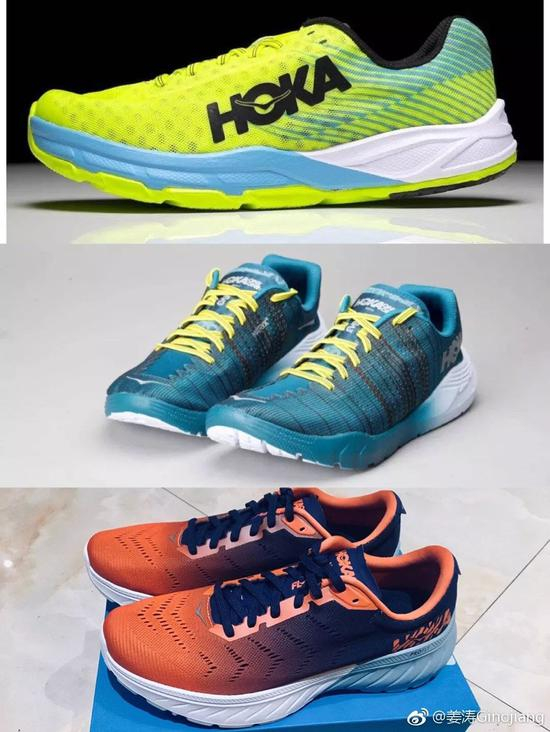 Hoka one one是一个不走寻常路的牌子,一直以来就是。在铁三、越野跑、马拉松各类比赛中均组织了官方战队参与及推广,取得了不错的成绩,并且愿意在新品研发上投入精力与资源。这三双鞋做为春季主打商品已经在国内精英队员及展会上露面了,均会在200g以内,需要关注的是EVO Carbon Rocket将会配置碳板,重量可能在180g~190g之间。