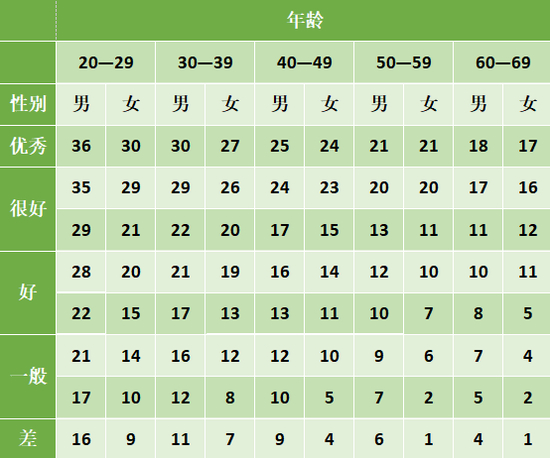 我们节选了美国运动医学会健康体适能评估手册《ACSM‘s Health-Realated Physical Fitness Assessment Manual》的标准,这样大家就可以根据表格中的标准来评估自己的体能水平了。
