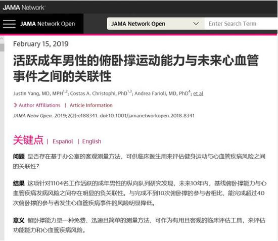 美国医学会杂志(the journal of the American Medical Association,JAMA)是国际顶级期刊,其在2月5日网络版中发表了一篇哈佛大学医学院的重量级的研究,证实了俯卧撑力量与未来发生心血管疾病的风险存在明显的负相关;