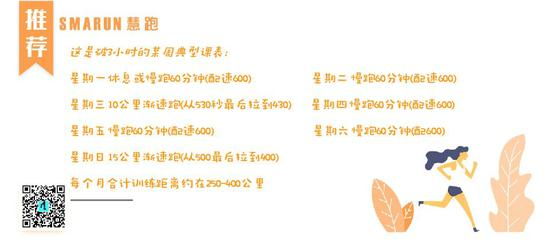 看到这样的课表你可能会说:”这样真的就够了吗?” 真的就是够了!而且大家可以注意到,他的渐速跑最后的速度,只是接近马拉松比赛时的配速,并没有要我们跑得比马拉松配速还快。