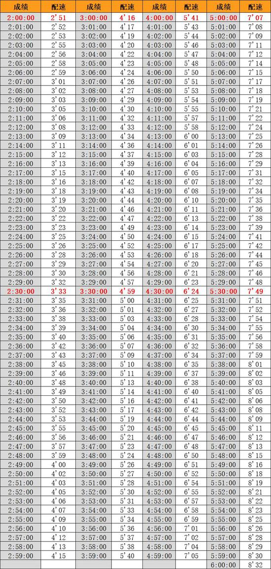 小编整理了一张全程马拉松配速表,希望对你有帮助哦~