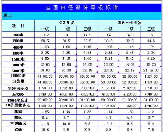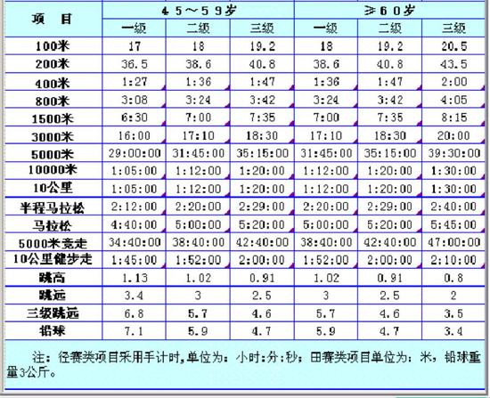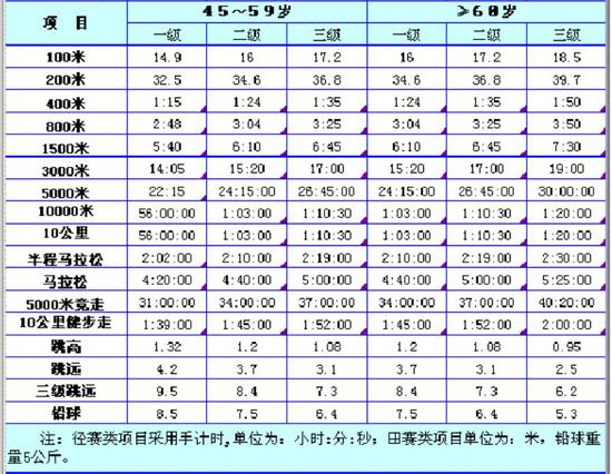 附件《大众选手等级评定成绩标准》是这样的,按项目分类: