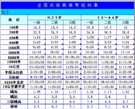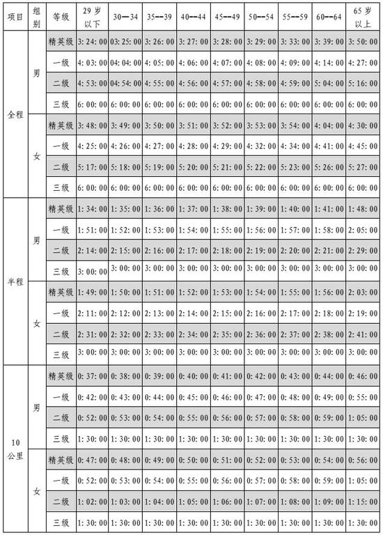 大众业余跑者的等级评定成绩标准