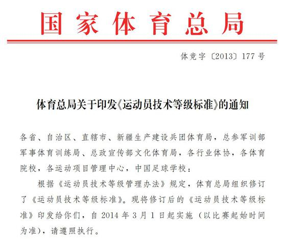 2013年11月,国家体育总局印发了新一版的《运动员技术等级标准》: