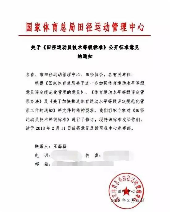 此外,2018年2月6日,国家体育总局运动管理中心修订了一份新的《田径运动员技术等级标准》(意见稿),发给了相关单位征求意见。