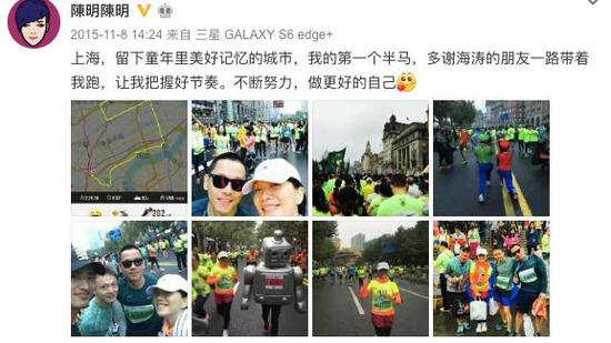 4月14日,北京半程马拉松落下帷幕。歌手陈明在微博上晒出了自己的跑步截图,并称:终于跑进了2小时。