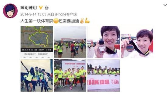 2014年9月14日,奥森公园,陈明完成了自己人生第一个10公里比赛——李宁10k。当时,她激动地发微博表示:“人生第一块体育牌,还需要加油!”