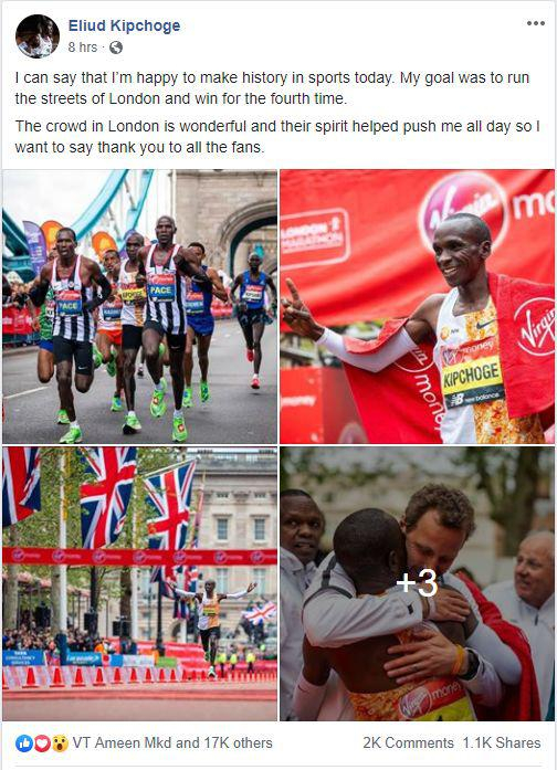 昨天赛后,基普乔格第一时间发表脸书,向粉丝们表示感谢: