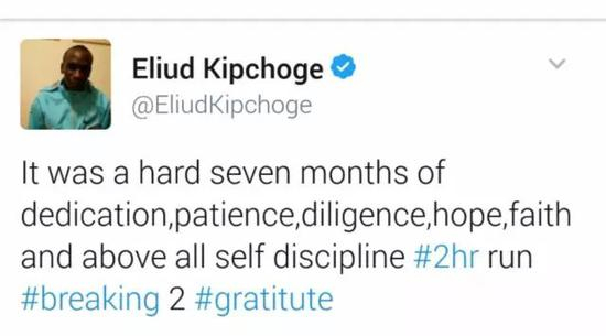 更多人开始成为基普乔格的粉丝应该是在2017年5月6日开始,当时基普乔格跑出2小时25秒的成绩后发了一条这样的推特。