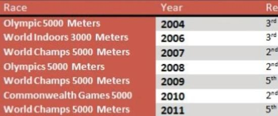 尽管2003年,19岁的他便在世锦赛上战胜两位名宿,2004年5000米最好成绩更是达到了12分46秒53,现在也能排在历史第六位。