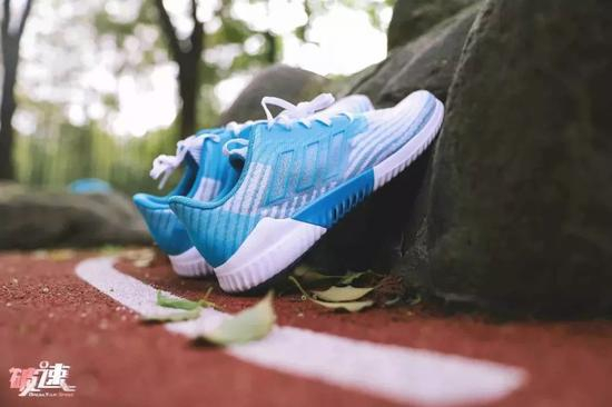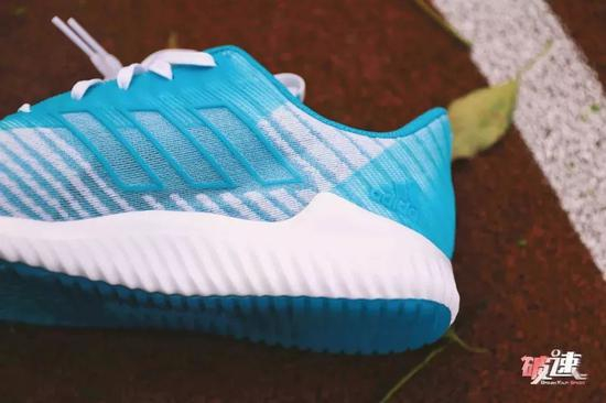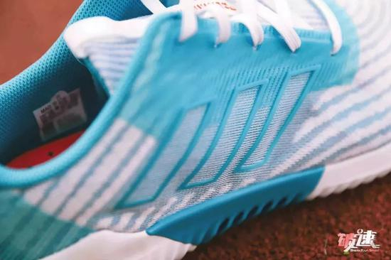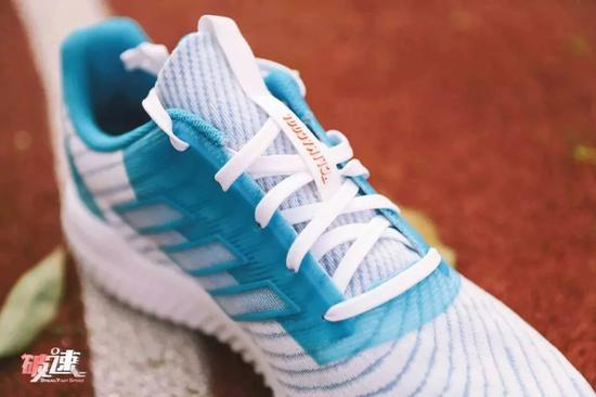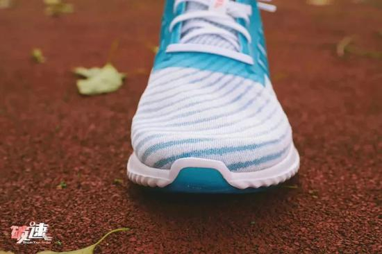Climacool清风系列跑鞋采用的是双层网布的鞋面,外层的网布为白色,内层的网布为蓝色,两层薄薄的网布中间夹杂着带状的编织物,让前掌的鞋面既保持柔软,同时增加了支撑效果。