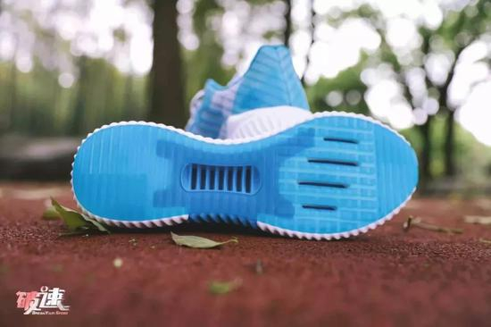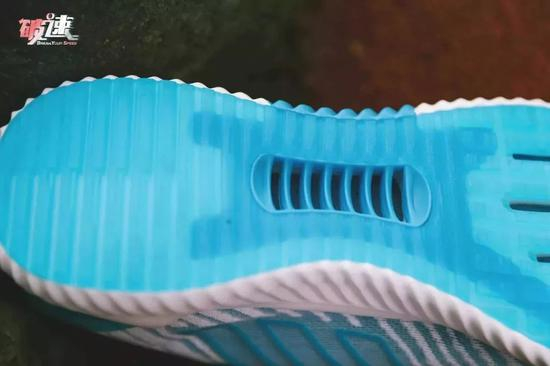 Climacool清风系列跑鞋的大底采用了水晶状的全掌橡胶,鞋底有大面积的条形凸起,增加了耐磨性能。 另外,鞋底前掌和中足部分还设计了排气孔,如果拿掉鞋垫,可以发现它完全是镂空的,与鞋仓只隔了一层网布。