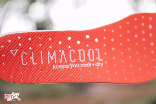 Climacool清风系列跑鞋的鞋垫又轻又薄,鞋垫上布满了大大小小的网眼,这样设计也是为了增强透气性,当你迈步时,气流从鞋底进入,透过鞋垫为双脚散热,再从中底的稳定片排除,如此循环,让跑者脚下生风。