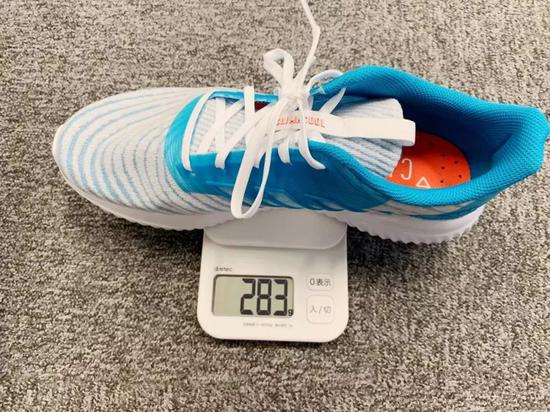 我穿的44码的跑鞋实测为283g,并不算一个很轻的重量,但实际穿着的感觉也没有数字显示的这么重,跑半马完全没有累赘感。