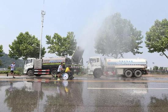 其次,除了喷淋站,还动用环保车喷洒“水炮”。
