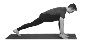 保持双手位于前腿两侧的地面并伸直后腿,后腿的脚后跟向后推压。
