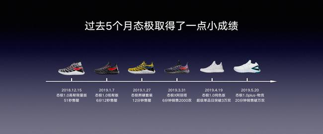 据悉,在态极1.0PLUS专业款“天择”发布前一个星期,同样基于“用户共创”理念下的态极1.0PLUS时尚款“物竞”已经开售,并创造了20分钟销售突破10000双,单日销量突破20000双的匹克态极销售新纪录,而把“差评”印上鞋盒,把用户意见和修改对策裱进相框的做法,让营销大号和用户都连送“好评”,称“匹克是中国最有诚意的品牌”。