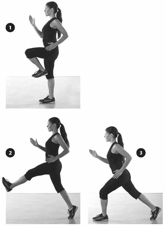 1~3。(起始姿势是迈出左腿时)双臂交替向右腿“行走”,与此同时将右腿迈向前方。