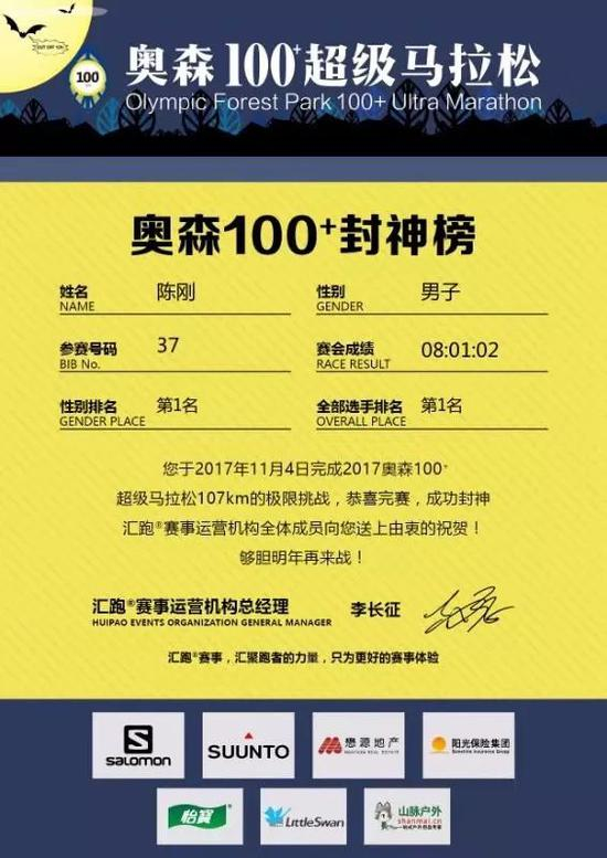 陈刚早年专攻路跑,2015年9月,完成他的首马,成绩是3小时35分,巅峰之战是2017年的奥森107公里超马,他以8小时01分钟02秒的成绩刷完奥森南北园十圈,即以4分半的速度狂奔107公里,一战封神。