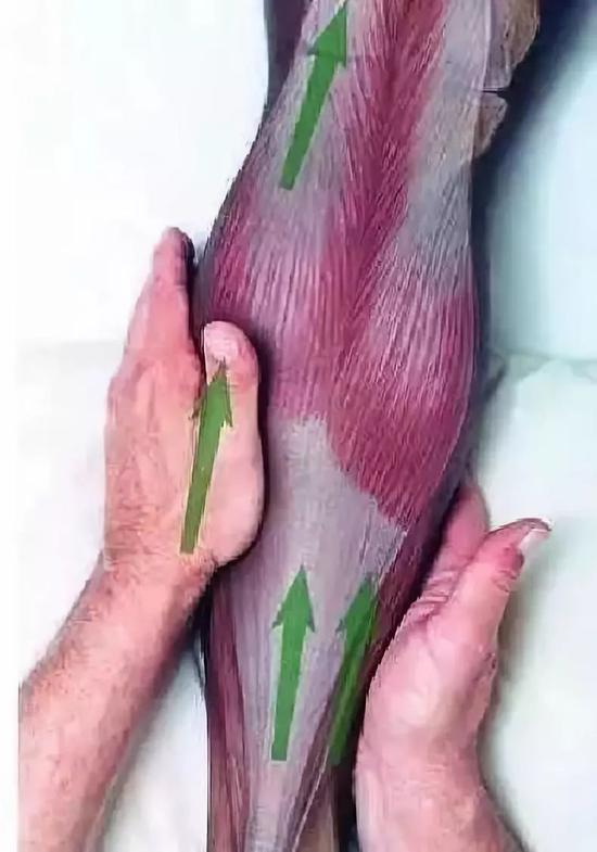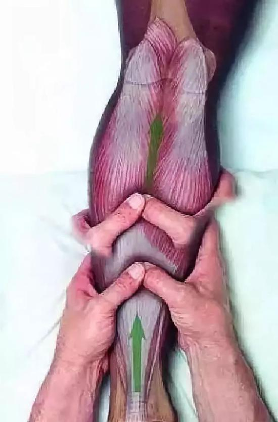 1、先按摩左腿,左手掌贴在小腿外侧,右手掌在小腿内侧,从膝盖开始,双掌夹住左侧小腿下推,推至踝部即往回拉,一推一拉反复按摩100次后,换右腿按摩100次。