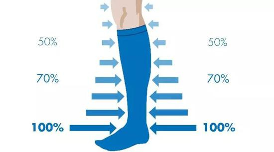 压缩袜通过从下至上逐级递减的的梯度压力,形成一个由下至上的正压力,促进静脉血的回流,减轻下肢血液淤积。