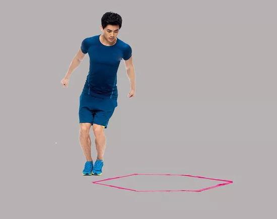 这样做→设置六边形标志线(边长40-60cm)站立于中心点。依次从中心点跳向标志线外,可以按顺时针或逆时针方向练习。