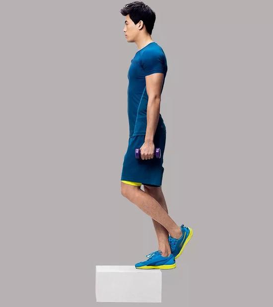 这样做 →持哑铃右脚单腿站于台阶上,左脚交叉放在右踝后侧。右脚保持平衡,抬起右侧足跟并保存2-3秒,然后慢慢回到起始位。