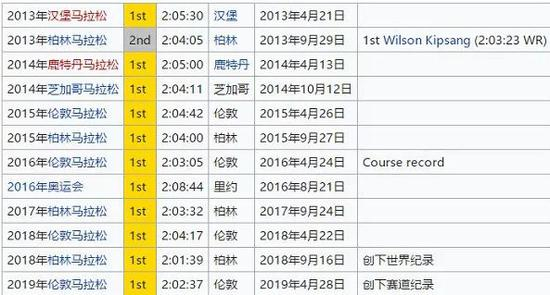 这位34岁的马拉松运动员,在2012年转战路跑。从2013年至今,基普乔格共参加12场马拉松正式比赛,拿到了11个冠军和1个亚军,其中包括连胜10场。