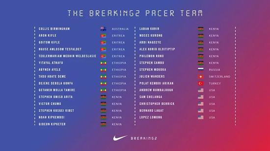 Breaking2挑战邀请了来自 8 个国家的29名运动员,18人分为6组,其他人作为替补保障队伍。
