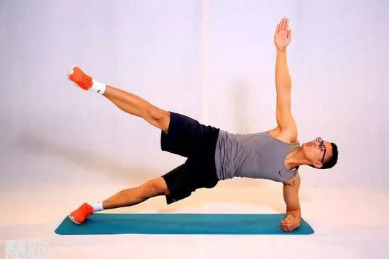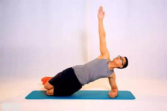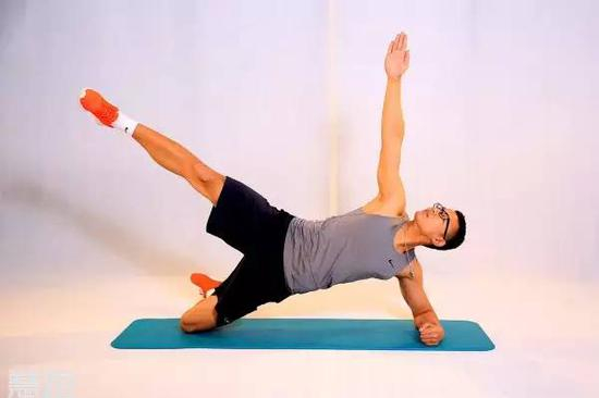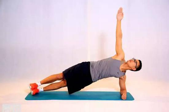 3。 有抬手动作的侧桥中,手要指向正上方,注意保持躯干稳定;
