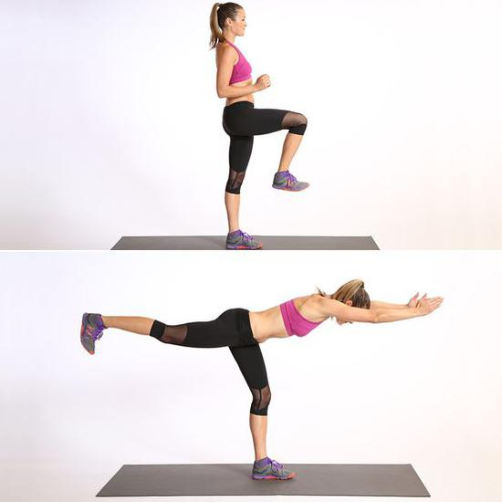 跑步专项核心训练主要是模拟跑步技术的力量训练,力量训练动作越像跑步,则力量训练效果越好,因为这样的力量训练可以直接向跑步转化,比如下图所示单腿硬拉接提膝就是典型的跑步专项力量训练。