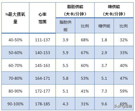 大量研究证明,当我们将有氧运动的心率控制在40%~60%的区间内的时候,脂肪作为运动能量来源的利用效率是最高的,是真正的“减脂”运动,大家仔细看下面这张表格就会发现。