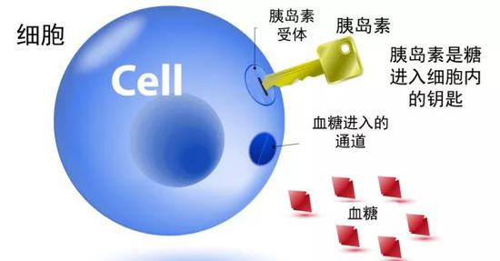 再给大家解释一下胰岛素以及胰岛素的作用,胰岛素是一种内分泌激素,它由胰腺分泌,进食以后导致血糖升高,这时胰腺就会反馈性地分泌胰岛素,胰岛素的作用很简单,那就是降低血糖,那么胰岛素是如何降低血糖的呢?我们称为允许作用,胰岛素作用于细胞,让细胞接纳糖或者存储糖,也就是说只有胰岛素与细胞结合,糖才能进入细胞内,糖进入细胞内后,血糖自然也就降低了,如果没有胰岛素的存在,那么即使细胞外的糖再多,糖也是无法被细胞吸收的,因此称为允许作用,也即只有胰岛素允许,糖才能进入细胞内。