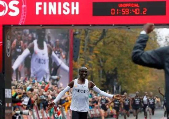 基普乔格在最后时刻全速冲过终点,时间定格在1小时59分40秒。