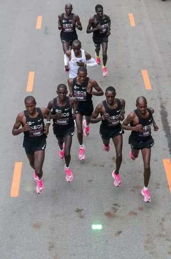 领跑团的跑位也很有讲究,他们分为六组,每次有5人在基普乔格身前,组成V字形,另外有2人在基普乔格身后的左右两边。之所以这样配置,是因为按照研究实验室的结果,这是最佳配速员防风阵型,会形成一道挡风屏障,有利于挑战者创造好成绩。