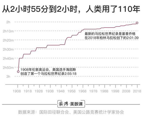 有意思的是,从1908年有马拉松世界纪录以来,人类一直在推进这项极限挑战的纪录。1908年时,马拉松的最快纪录还是2小时55分18秒跑完,到110年后,人类已经在一次次向“破2”发起挑战。