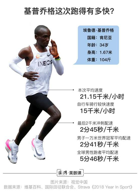 大部分中国马拉松跑者,完成全程马拉松需要4-5个小时;而一般人跑完半马的时间可能都需要2小时以上。根据欧美运动软件Strava发布的2018年运动报告,全球跑者的平均速度是12.86公里每小时。甚至拿人们平时骑的自行车来说,一般时速在12-20公里之间,都很难达到基普乔格这次创造历史的速度。
