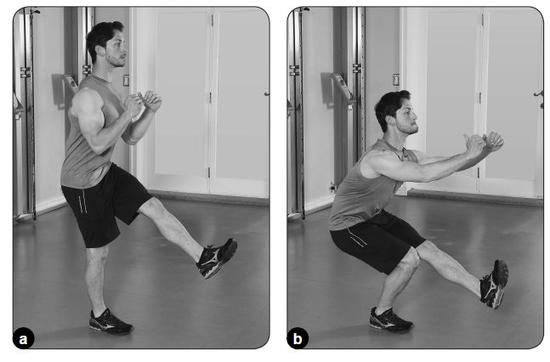左腿伸直向上抬。开始下蹲,髋部向后坐并将重心落在右脚跟上。尽可能深地下蹲,同时保持核心肌群的参与,并将双臂保持在胸前以维持平衡。髋部和脚跟发力,如果有可能,在整个训练组中都不要让左脚接触地面。