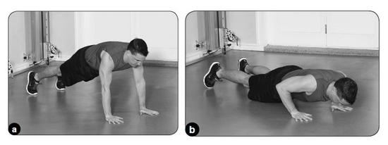 双手正好超过双肩置于地面上,双脚大致与髋同宽。胸部朝向地面做俯卧撑,期间不要让髋部下垂。