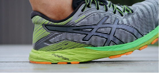 FlyteFoam作为ASICS主推的中底材料,兼具轻量和超高的缓冲性,据ASICS人体工学研究所的研发数据,FlyteFoam中底要比标准的EVA材料轻55%,同时缓冲性能增加76%,在缓冲性能的表现上绝对是优秀的。无论是短距离还是更长距离的路跑,FlyteFoam材料给双脚的缓冲感受都十分明显,甚至是长距离的后半程DynaFlyte仍然能够保持高效的缓冲表现,帮助跑者跑得更快、跑速再升级。