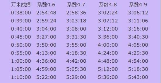 以下提供一个网上的万米成绩与全马成绩预测表,供大家参考