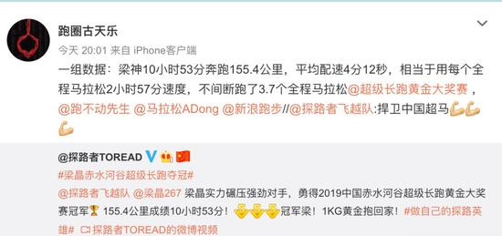当然,上述换算还忽略了补给时间,此外,梁晶在比赛中还不断发朋友圈直播自己的状态。