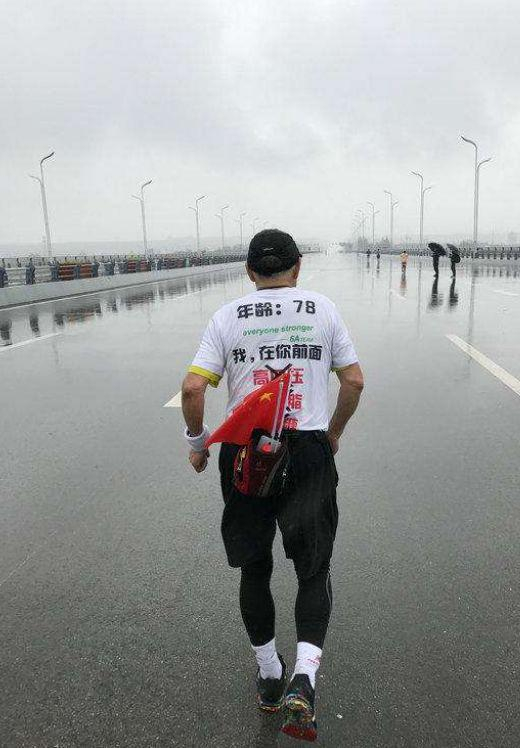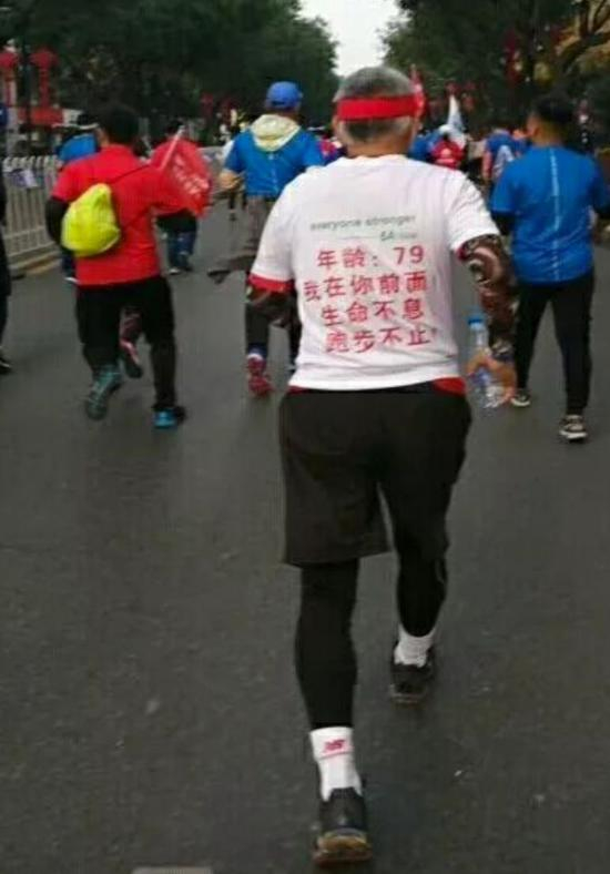 昨天在西安马拉松中,跑友拍到一位满头花白的老人,他身着的白色T恤上,印着一段鲜红的字:年龄80 ,我在你前面!生命不息,跑步不止!
