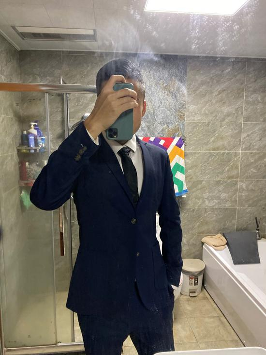 结合以上思路,我在衣柜里还真找到一件三四年前买的化纤面料、修身款、一千出头的某快消品牌西装。