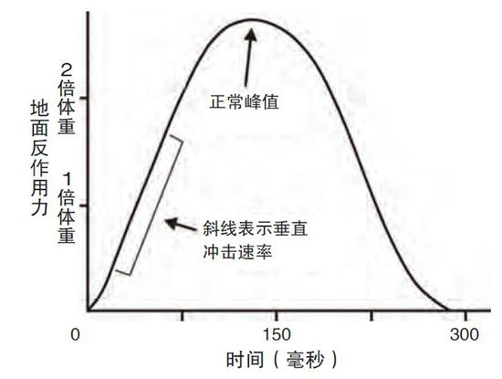 图中显示了着地时地面反作用力变化,着地时总的作用力约是体重的2倍,斜线代表了着地过程中冲击力的变化快慢,斜线越陡代表冲击力增加越急剧,越缓则代表冲击力增加越柔和。