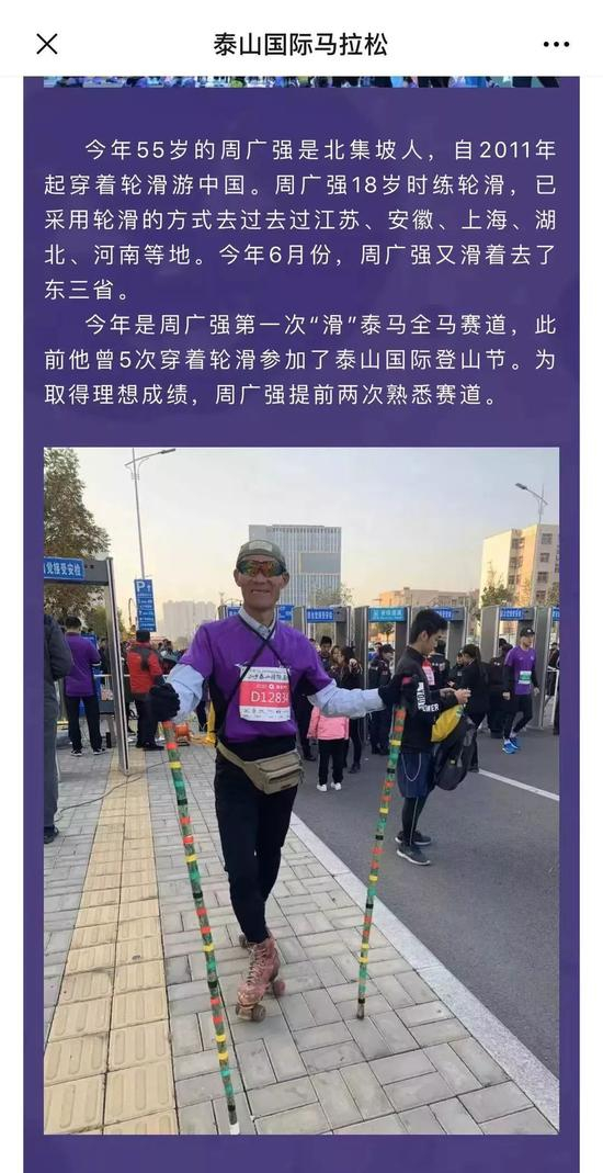 今年是周广强第一次“滑”泰马全马赛道,此前他曾5次穿着轮滑参加了泰山国际登山节。为取得理想成绩,周广强提前两次熟悉赛道。