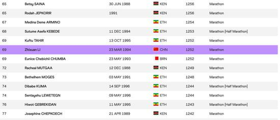 在世界田径(原国际田联)官网查询得知,在11月5日最新一期的排名中,李芷萱已经累积了1252个积分,排在世界女子选手第69名,在亚洲范围内,她只落后3名巴林选手。