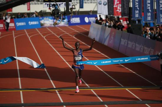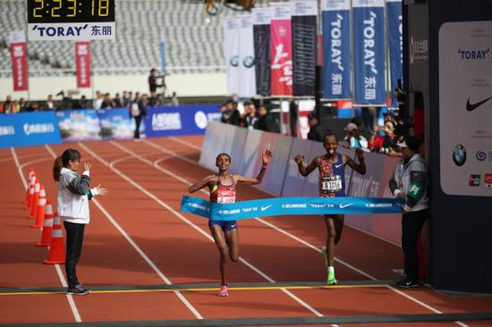 图说:去年创造上马赛会纪录的埃塞尔比亚选手梅里希,以2:23:18的成绩获得女子组冠军。同样,她也没能创造新的赛会纪录。