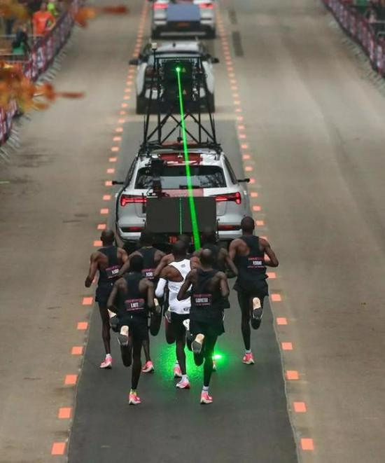 除此之外,团队还专门请了教练来调整陪跑人的状态。并且在队伍前方还有会发出指示光线的配速汽车,让整个队伍可以随时了解自己的速度是否符合预期。
