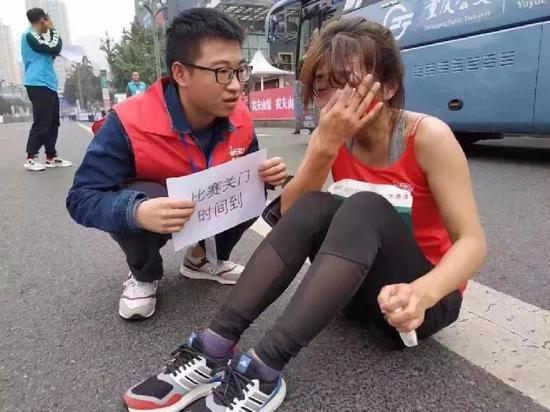 “明知道会超时了,收容车也在旁边跟我招手,看到只有两三百米了,旁边的小哥哥举着牌子告诉我比赛关门时间到的时候,我实在忍不住崩溃了,心里特别难过。”